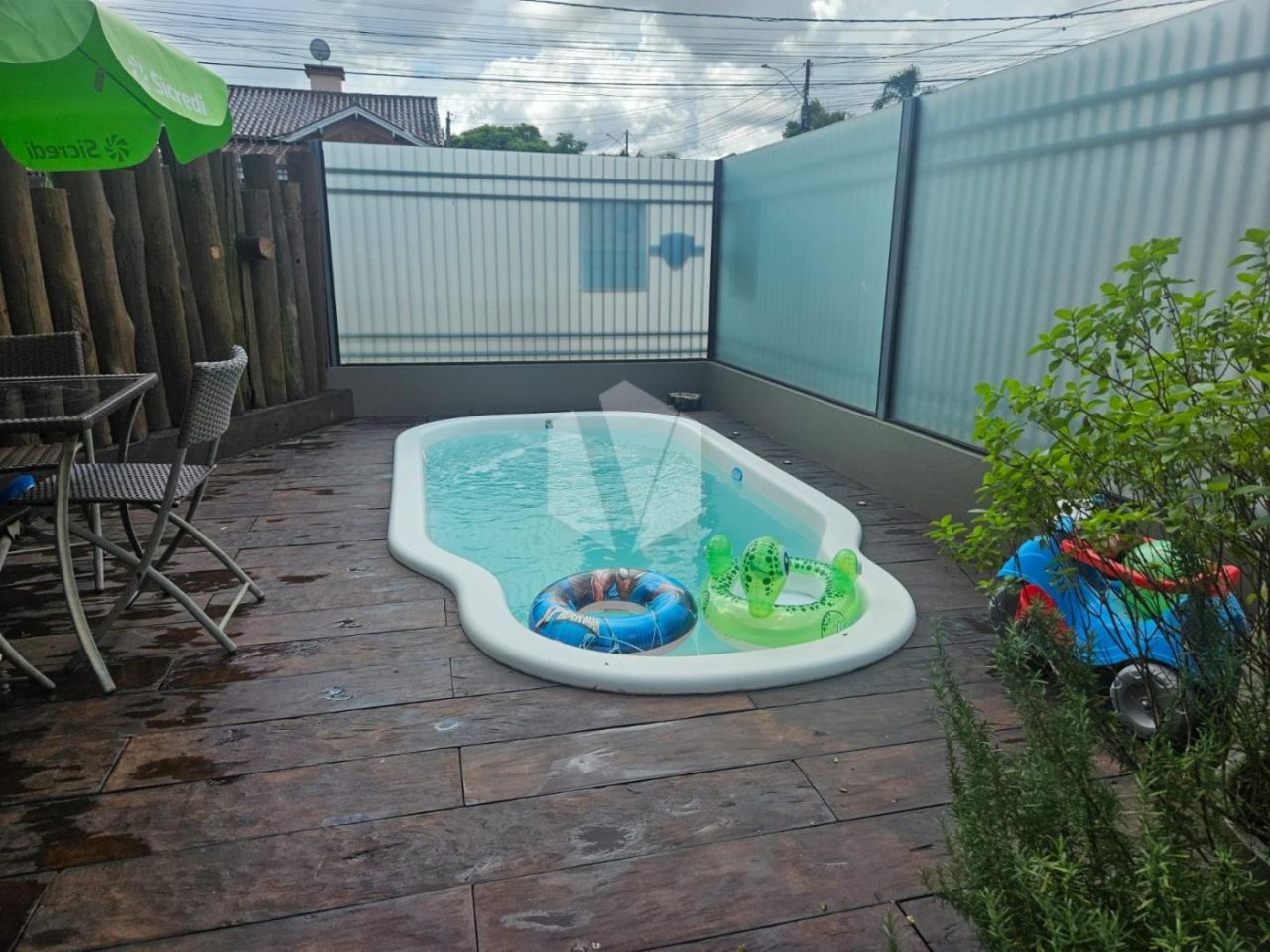 sala de jantar, cozinha, área de serviço, um banheiro social, lavabo, garagem para 2 veículos e pátio com piscina.